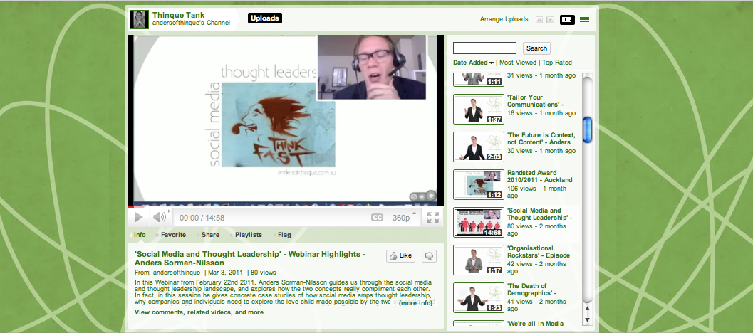 In this Webinar from February 22nd 2011, Anders Sorman-Nilsson guides us through the social media and thought leadership marketing landscape, and explores how the two concepts really compliment each other. In fact, in this session he gives concrete case studies of how social media amps thought leadership, why companies and individuals need to explore the love child made possible by the two concepts, and asks some thought provoking question on how you can use social media to spread your ideas far and wide. Check it!